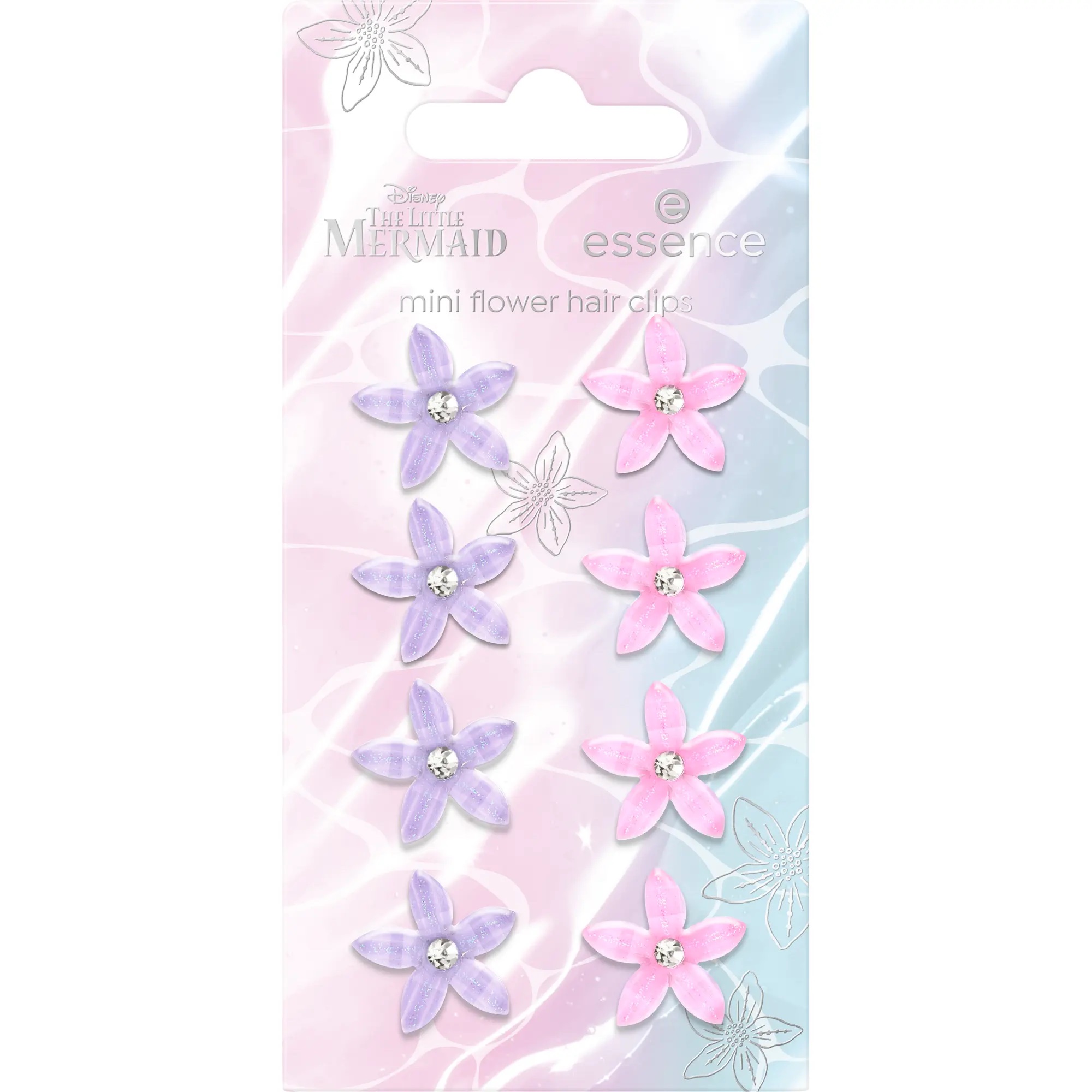 Aggiungi un tocco di scintillio oceanico al tuo look con le mini mollette per capelli a forma di fiore di essence 01 Jewel Of The Sea, ispirate a Disney The Little Mermaid.. Questo bellissimo set di mollette in delicate tonalità di rosa chiaro e lilla include otto fermagli ispirati al morbido fiore tra i capelli di Ariel. Perfette per aggiungere un tocco incantevole e sottomarino a qualsiasi acconciatura, queste mollette trasformano i look di ogni giorno in momenti magici. Che tu stia creando trecce, onde o uno chignon casual, sono il dettaglio finale più dolce per la tua avventura di styling.