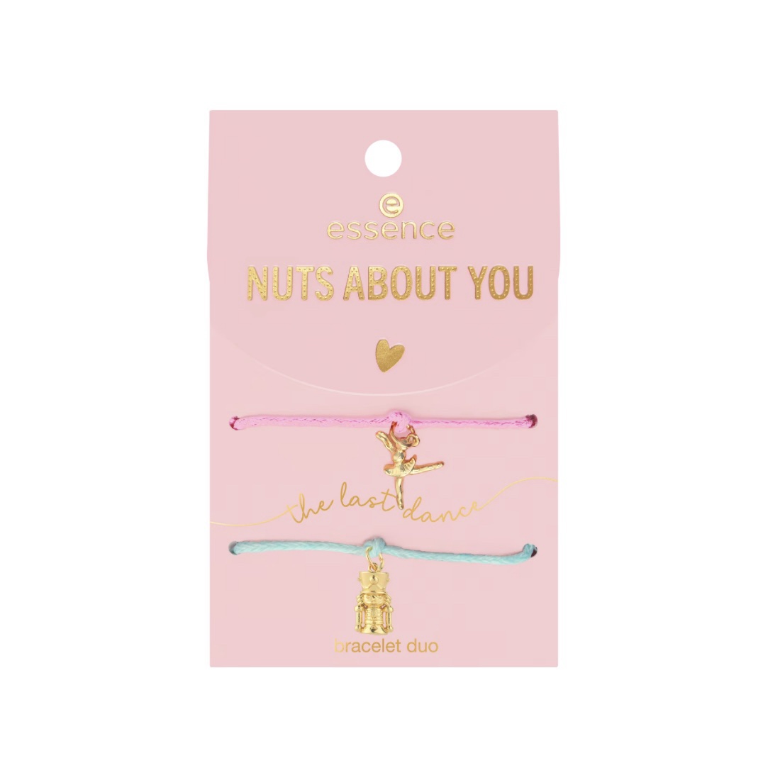 Festeggia la stagione delle feste con stile con il duo di bracciali essence NUTS ABOUT YOU 01 The Last Dance. Questo adorabile set include due braccialetti regolabili con cordini in menta chiaro e rosa cipria, ciascuno impreziosito da un delicato ciondolo metallizzato dorato. Un bracciale presenta un ciondolo dettagliato a forma di Schiaccianoci, mentre l’altro sfoggia una ballerina elegante nel mezzo di una danza. Indossati insieme o separatamente, questi dolci accessori aggiungono un tocco giocoso e festivo a qualsiasi outfit – perfetti da condividere con un’amica o da tenere entrambi per te.